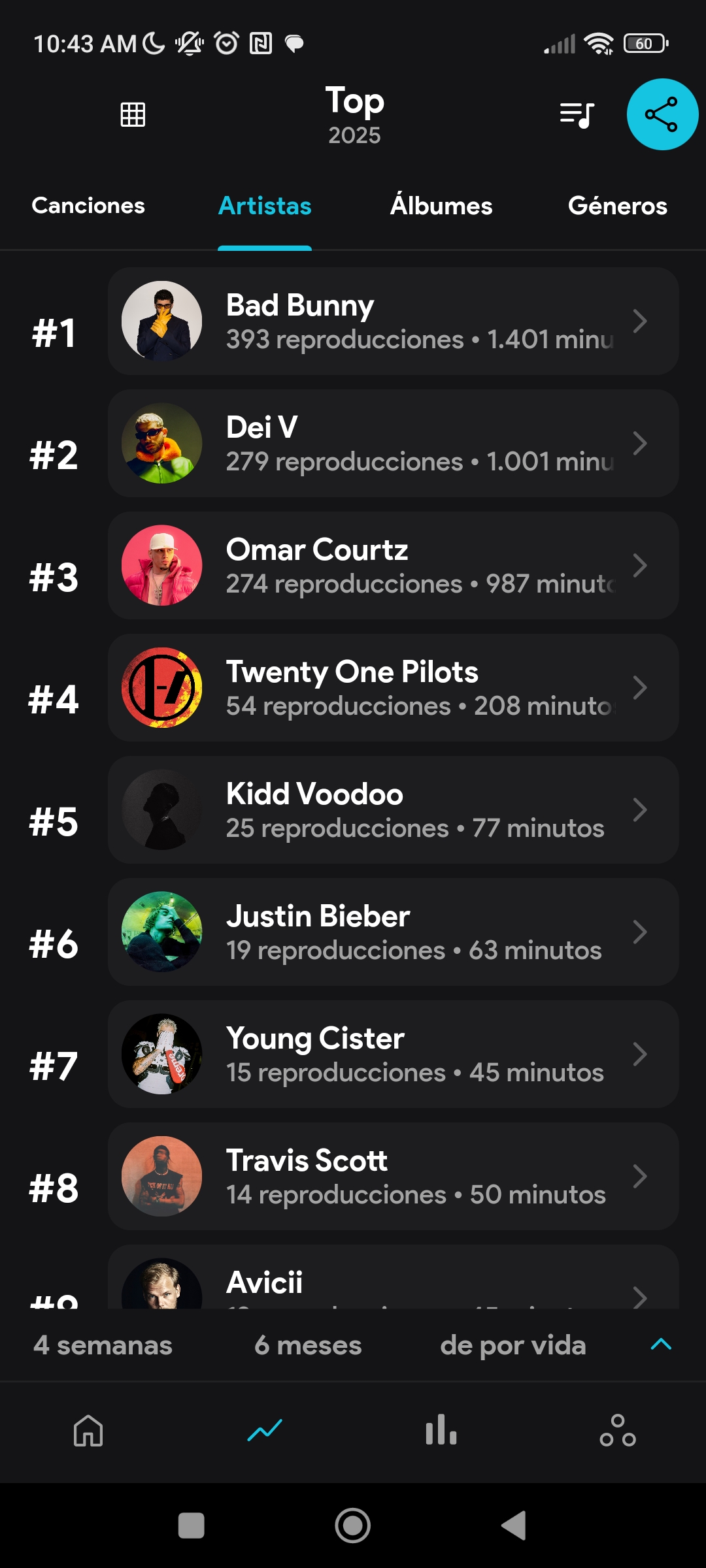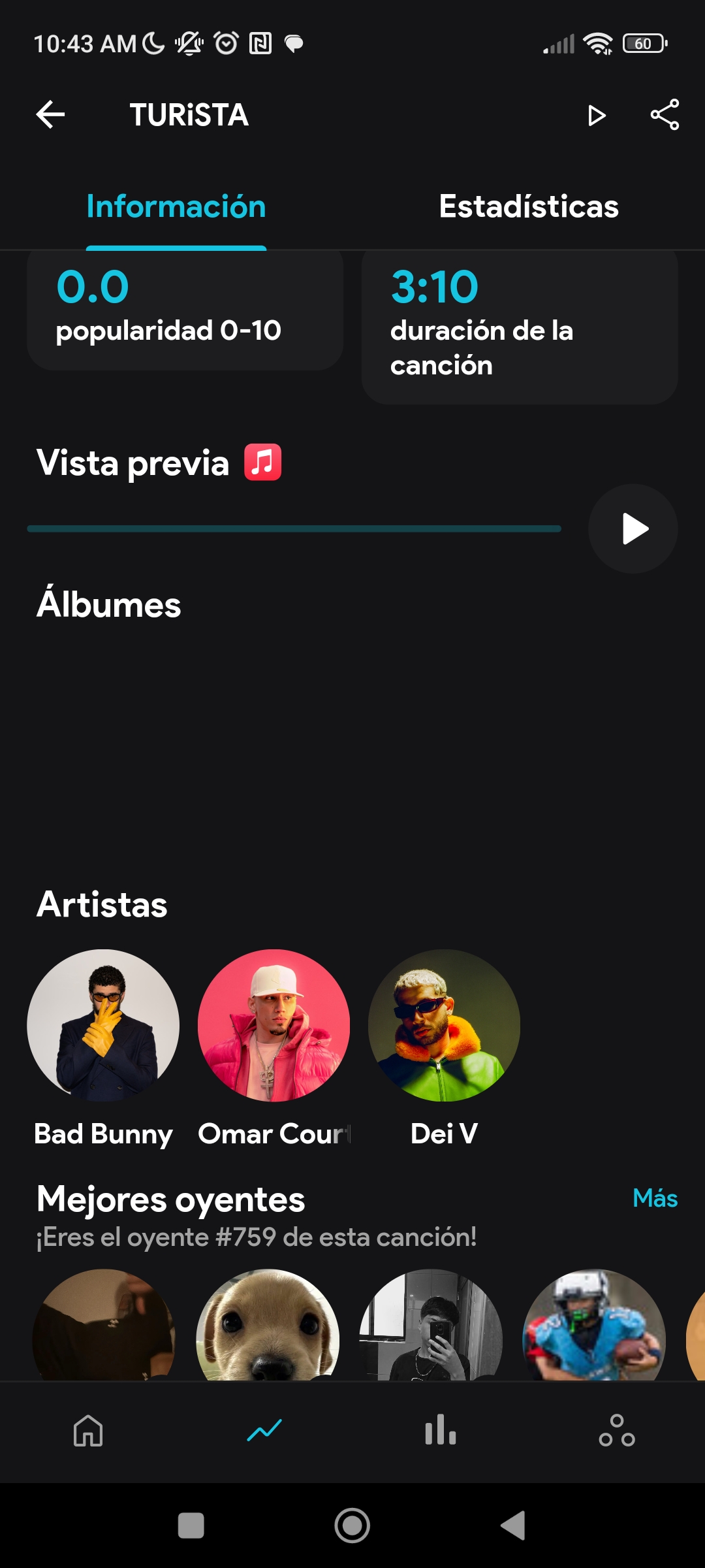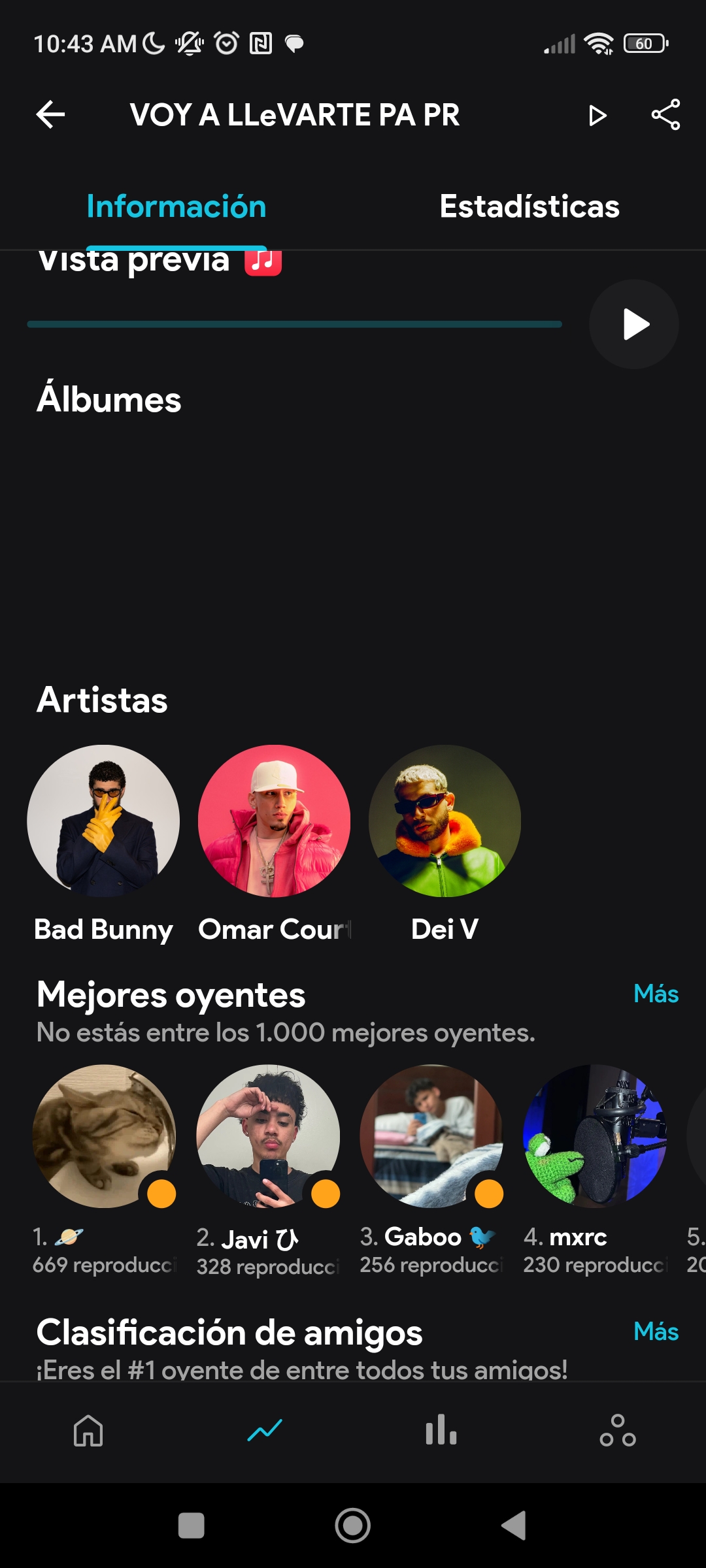 Hay un bug con el último de Bad Bunny - DeBÍ TiRAR MáS FOToS ya que en todas las canciones aparece en spotistats como artistas Dei V y Omar Courtz cuando estos solo colaboran en una lo que hace que cuenten reproducciones a estos artistas cuando no forman parte del track